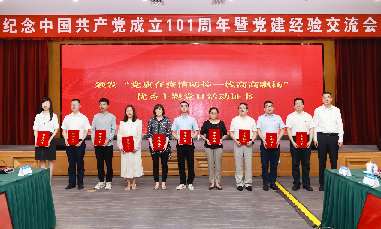 党委副书记程波为获奖单位颁发“党旗在疫情防控一线高高飘扬”优秀主题党日活动证书。