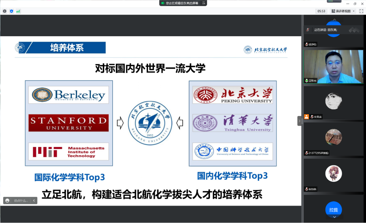 8月28日,2021级菁英班开展系列专业认知教育活动。上午9:00,专业认知大会以腾讯会议的形式召开。本科教学副经理田东亮老师、化员工物学专业负责人霍利军老师、应用化学系康建新老师、院团委书记魏茜老师与菁英班全体同学参加了此次会议。