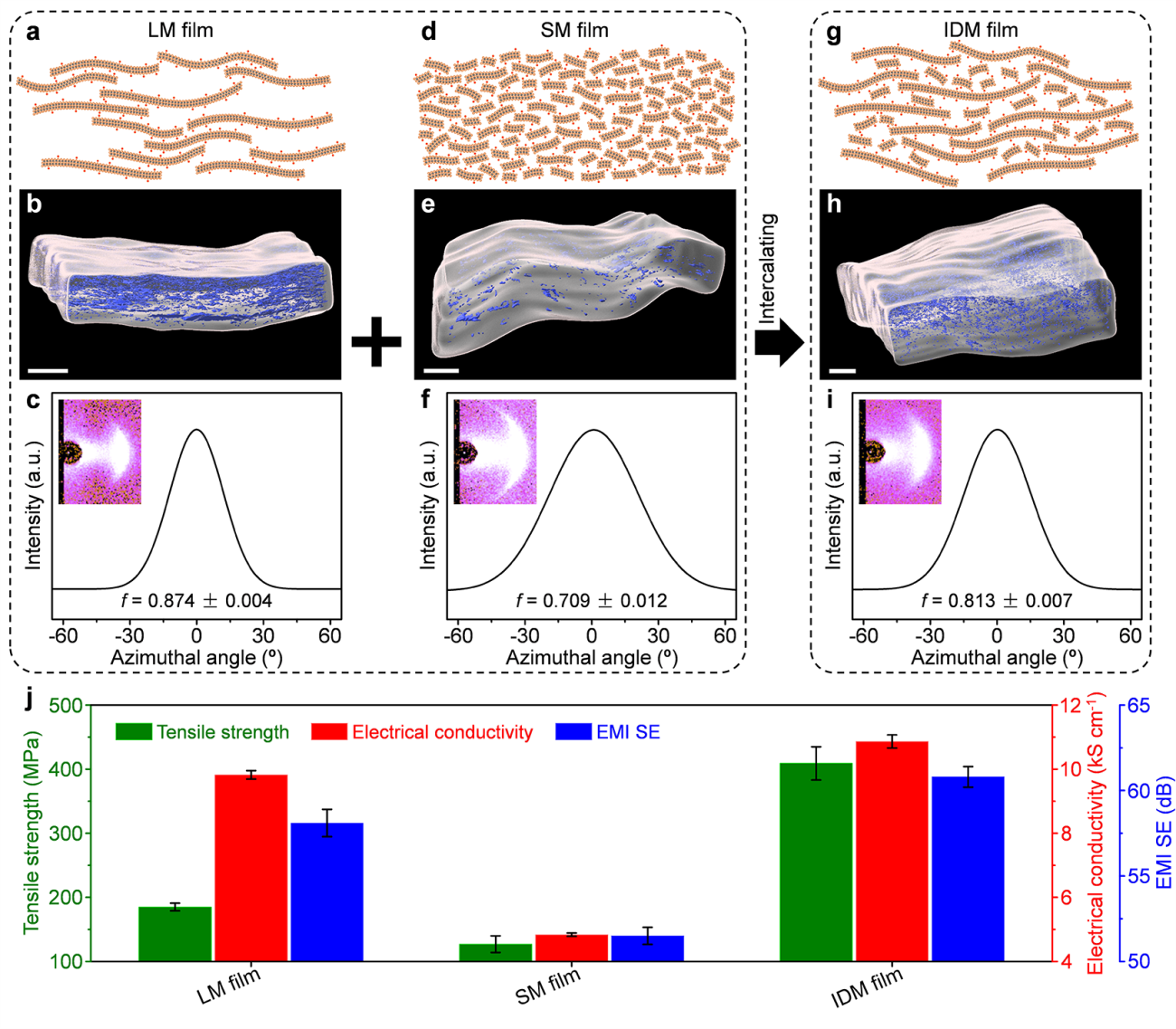 图2. LM、SM和IDM薄膜的结构和性能对比:(a-c)LM、(d-f)SM和(g-i)IDM薄膜的结构模型、FIB-SEM三维重构结构以及WAXS和相应的002峰方位角扫描曲线;(j)LM、SM和IDM薄膜的拉伸强度、电导率和电磁屏蔽系数