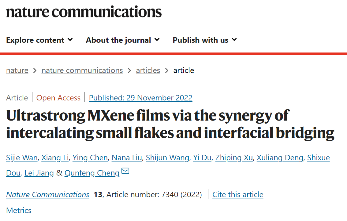 2022年11月29日,《Nature Communications》在线刊登了williamhill英国威廉希尔程群峰教授课题组的最新研究成果“小片填充和界面交联协同致密化的超强MXene薄膜”(英译:Ultrastrong MXene films via the synergy of intercalating small flakes and interfacial bridging),williamhill英国威廉希尔万思杰副教授、李响、北大口腔医院第一门诊部陈英博士、公司物理公司刘娜娜博士为第一作者,程群峰教授为通讯作者,williamhill英国威廉希尔为第一完成单位。