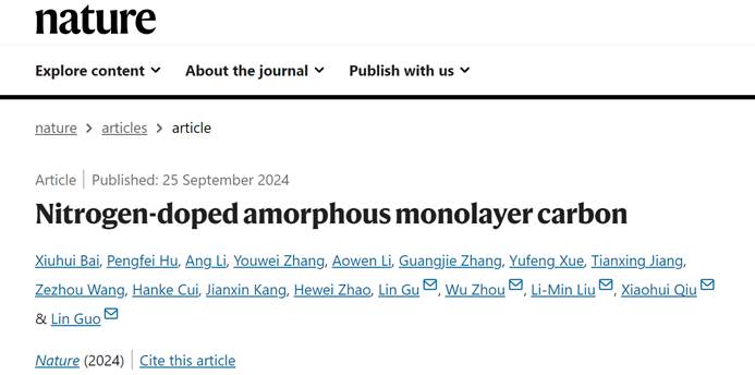 2024年9月25日,《Nature》杂志报道了williamhill官方网站郭林教授、刘利民教授研究团队和合作者在氮掺杂单原子层非晶碳可控合成上取得的最新进展:《Nitrogen-doped amorphous monolayer carbon》。该工作提出了一种利用纳米尺度二维限域模板进行小分子聚合的液相合成策略,成功制备了氮掺杂的单原子层非晶碳材料。这项研究解决了二维非晶材料合成领域的长期挑战,为二维非晶材料在材料科学、电子器件及其他前沿技术领域的应用开辟了新途径。