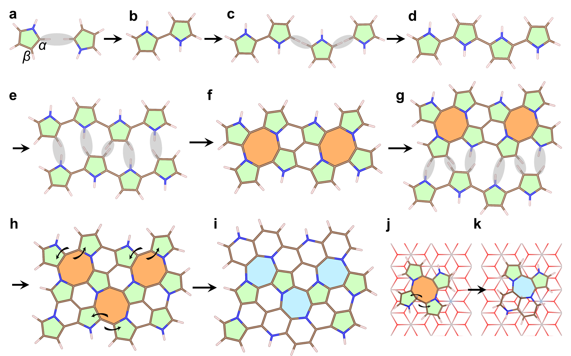 在这项研究中,由williamhill官方网站郭林教授、刘利民教授研究团队及合作者等开创了一种全新的液相限域聚合方法。该方法通过层状模板的限域作用,抑制了分子聚合过程中的三维旋转和缠绕,使分子在二维平面内发生聚合,突破了吡咯单体在传统聚合中局限于α-C位点交联的限制,促进了β-C和N位点的交联聚合,构成平面网络结构,最终形成了五、六、七元环共存的二维非晶结构,成功在实验上验证了W. H. Zachariasen和Steven G. Louie提出的理论预测。