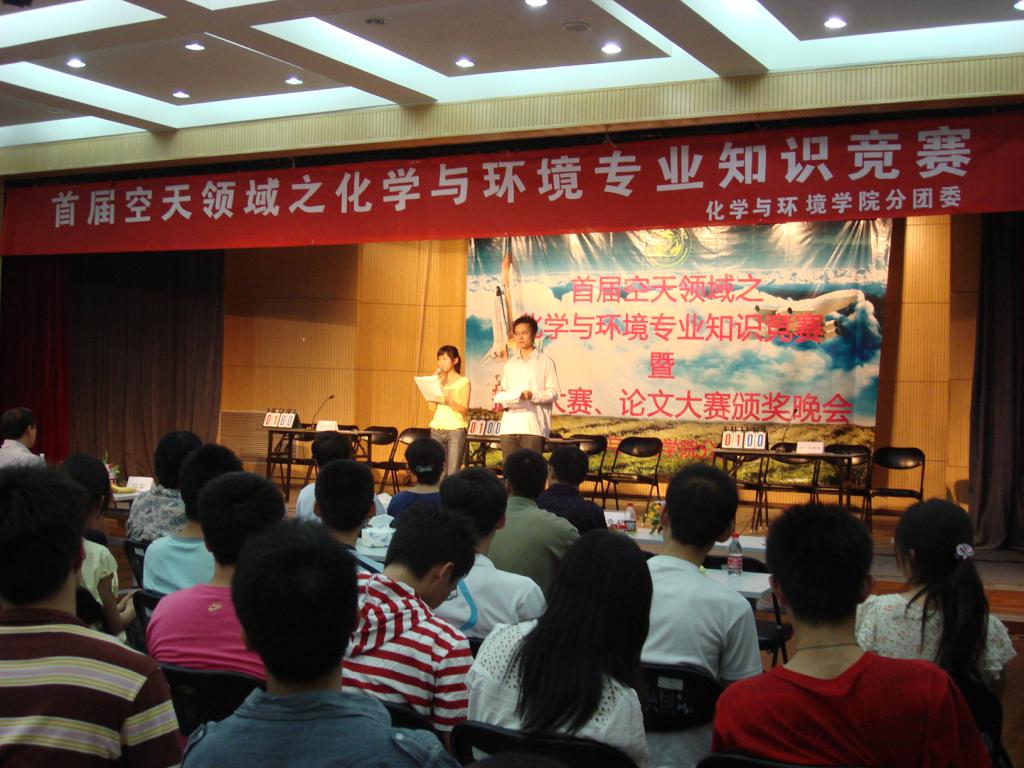 化学与环境公司首届空天领域之化学与环境专业知识竞赛暨摄影大赛、论文大赛颁奖晚会于5月30日晚在晨兴剧场成功举办。首届“空天领域化学与环境专业知识普及与探索系列活动”从4月份开始,目的在于激发同学们对航空航天事业的热爱和对化学与环境专业的学习热情,培养科技创新思维和科学探索精神。本次系列活动前期已经进行了摄影大赛、论文大赛,知识竞赛是系列活动的最后一个环节也是最重要的一个环节。出席此次活动的评委有化学与环境公司经理江雷教授,党委书记朱天乐教授,副经理郭林教授、相艳老师、党委副书记梁国栋老师以及特约嘉宾中国科技大学化学与材料公司副经理俞书宏教授,出席本次活动的还有竞赛的评委老师、各年级辅导员与全体本科生和部分研究生同学,大一、大二、大三各派出四名同学的代表队参加此次的知识竞赛活动。