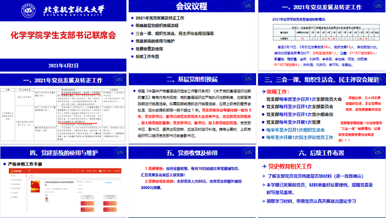 会上,崔钰莹老师进行党建业务工作分享,从“党员发展”、“支部换届”、“三会一课”、“党建系统使用”、“党费收缴及使用”及“后续工作安排”六个方面进行介绍。