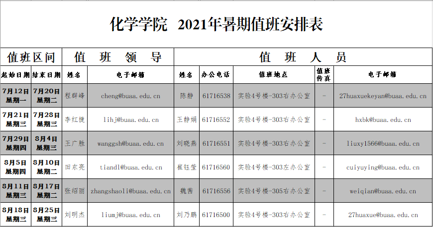 2.公司党政办公室要切实做好节日期间的安全保卫、保密、防火、防盗工作,保证值班人员按时在校在岗值班(08:30-11:30,14:00-17:00)周末除外,确保校园安全稳定,值班领导及人员情况见下图(也可下载附件):